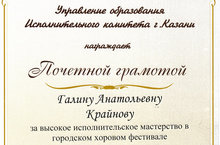 Почетной грамотой Управления образования "за высокое исполнительское мастерство в городском хоровом фестивале" награждена Крайнова Галина Анатольевна.