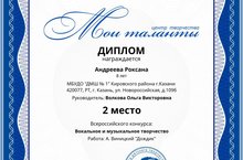 Поздравляем ученицу 2 класса Андрееву Роксану (преподаватель - Волкова О.В.) - Лауреата 2 степени Всероссийского конкурса "Вокальное и инструментальное творчество". Конкурс проводился Всероссийским центром детского творчества «Мои таланты».