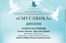 «Смуглянка» в исполнении фортепианного дуэта в составе Тамгюл Малики и Яруллиной Дарины стала лауреатом 2 степени на Всероссийском конкурсе «Смуглянка».
