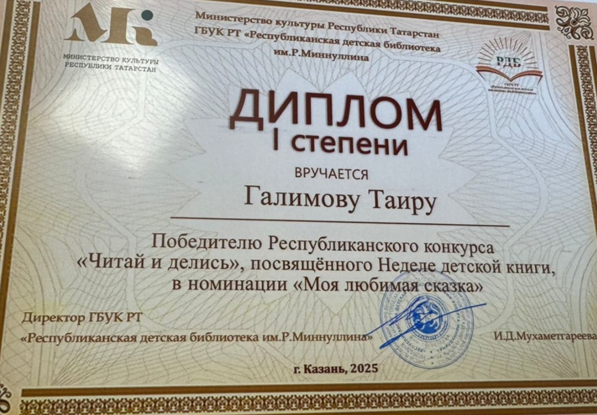 Наш воспитанник - талантливый юный читатель и рассказчик Галимов Таир стал победителем Республиканского конкурса «Читай и Делись», посвящённого Неделе детской книги. Организатором конкурса выступила Республиканская детская библиотеки им.Р.Миннуллина. Поздравляем Таира с успехом и желаем ему сохранить любовь к книгам и чтению.