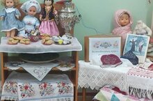 Тәрбияче: Исәнмесез, балалар. Хәерле көн. (Балалар җавабы). Мин бүген сезнең өчен тәрбияче түгел, ә экскурсовод булырмын. Сезгә күрсәтү өчен, “Әбием сандыгы серләр” дигән күргәзмә әзерләдем.Күрәсезме, менә бу матур сандыкны, аның серләрен беләсегез киләме? (Балалар җавабы). Беләсегез килә, якынрак килегез. (Балаларны сандык янына чакырам, капкачын ачып, андагы экспонатлар белән берәм-берәм таныштырам, алар турында сөйлим, балаларга үзләре теләгән әйберләрне тотып, киеп карарга мөмкинлек бирәм. Ахырдан балалар үзләре теләгән киемнәрне киеп, экспонатларны тотып, күмәк фотогага төшәбез.
