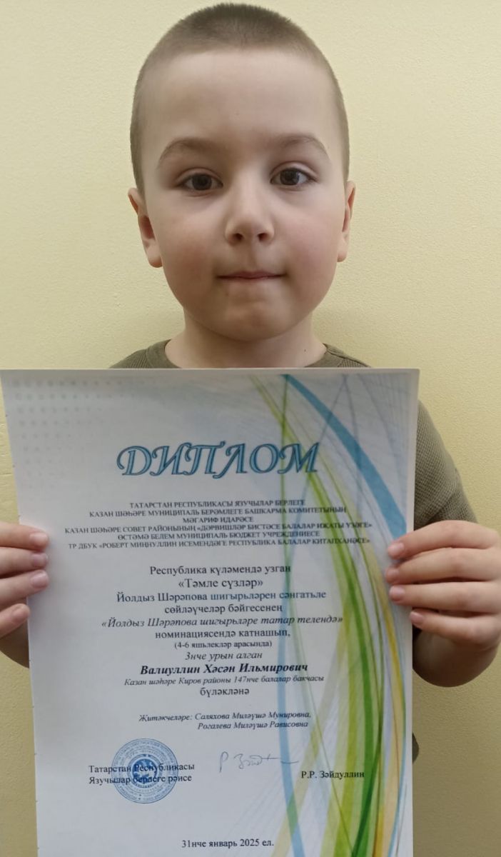 "Тәмле сүзләр" республика шигырь укучылар бәйгесендә катнашып, "Йолдыз Шәрәпова шигырьләре татарча" номинациясендә 3 урын яулаган Вәлуллин Хәсәнне котлыйбыз! Тагын да зуррак уңышларга ирешергә язсын!