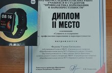 Дипломом за II место в номинации "Сущность и содержание профилактики наркомании и наркопреступности" награждается ученица 8А класса Фадеева Ульяна. Научный руководитель: Гайнутдинова Л.Ш.