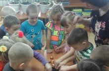 Уртанчылар әзерлек төркеме балалары тәрбияче апалары белән берлектә табигать почмагында даими эш алып баралар.Гөлләрнең тузаннарын сөртеп, төбен йөмшарталар, су сибәләр. Бүген балалар суган утырттылар.