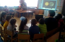 Балаларның космос турындагы күзаллауларын киңәйтү; логик фикерләүләрен, хәтер һәм дикъкатьлекләрен үстерү; космонавтика өлкәсендәге белгечләргә хөрмәт хисе тәрбияләү максатыннан зурлар төркемендә Шафигуллина И. Х. "Галәмгә сәяхәт" темасына бердәм белем бирү эшчәнлеге үткәрде. Балалар планеталар, күк җисемнәрен, беренче очучыларны искә төшерделәр. Галәмгә очу өчен тырыш, белемле, уңган, булган, көчле булырга кирәклеген, спорт белән даими шөгыльләнергә кирәклеген искәрттеләр.