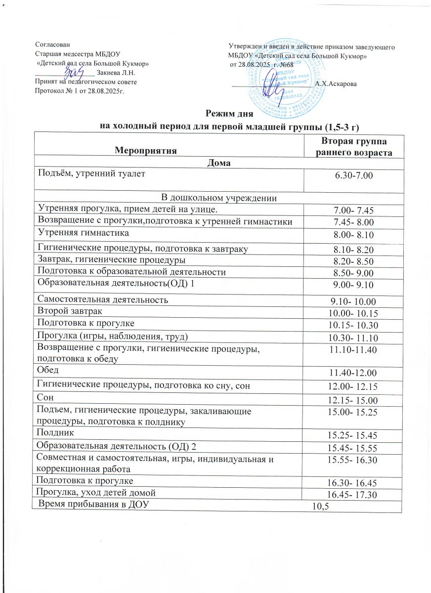 Режим дня на холодный период времени 2024-2025 учебный год второй группы раннего возраста