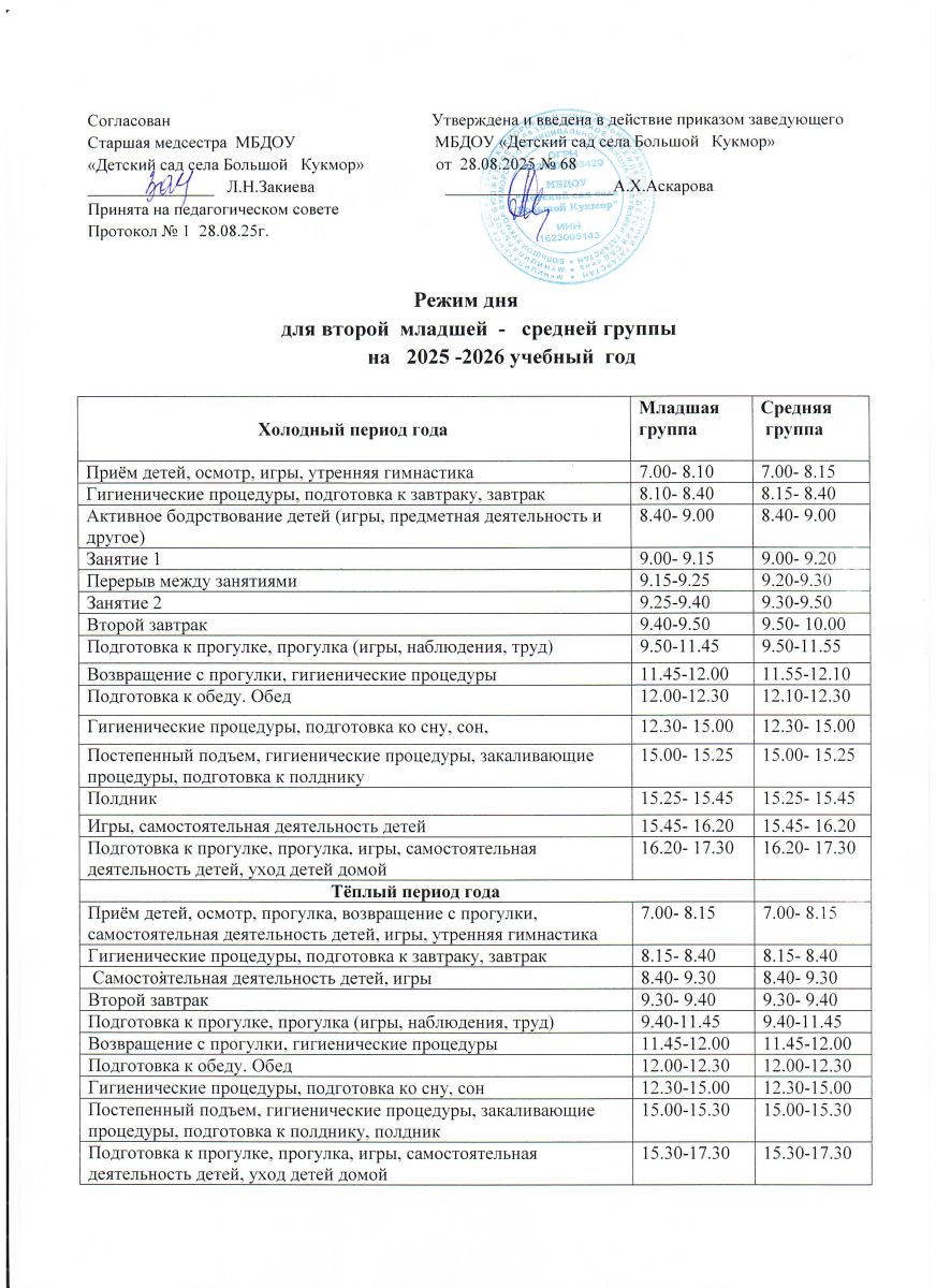 Режим дня на холодный период времени 2025-2026 учебный год младшей-средней группы