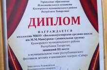 Поздравляем наших юных артистов! Коллектив дошкольной группы МБОУ «Большекукморская средняя школа им. М.М. Мансурова» завоевал III место на муниципальном этапе республиканского фестиваля детских и юношеских театров «Сайяр»Этот диплом — признание творческого таланта, усердных репетиций и слаженной работы детей, педагогов и родителей. Каждое выступление — это шаг к большим сценам и новым победам! Благодарим организаторов — Управление образования Кукморского муниципального района — за возможность раскрывать потенциал юных дарований.Желаем нашему коллективу вдохновения, ярких ролей и ещё большего числа аплодисментов! Вперёд, к новым вершинам!