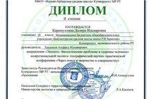 "Эзләнүләр һәм иҗат аша камиллеккә таба" дип исемләнгән төбәкара фәнни-гамәли конференциядә, 10 нчы сыйныф укучысы Кәримуллина Диләрәне (җитәкчесе Хисамиев А.М.) "Экологик-биологик проблемалар һәм кеше сәламәтлеге" юнәлешендә 2нче дәрәҗә дипломга ия булуы белән котлыйбыз!