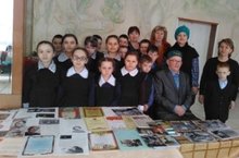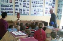 Рәсемдә: музей җитәкчесе Абдуллин Васил Минемуллович балаларны авылыбызның мактаулы кешеләре белән таныштыра.