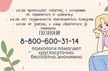 В Федеральном координационном центре по обеспечению психологической службы в системе образования Российской Федерации круглосуточно работает Горячая линия кризисной психологической помощи, обратиться в которую можно по номеру 8-800-600-31-14.