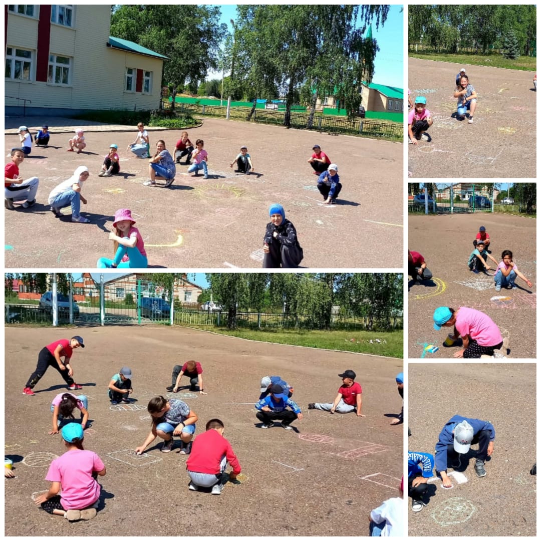 Во второй половине дня дети рисовали мелом на асфальте рисунки на спортивную тему.