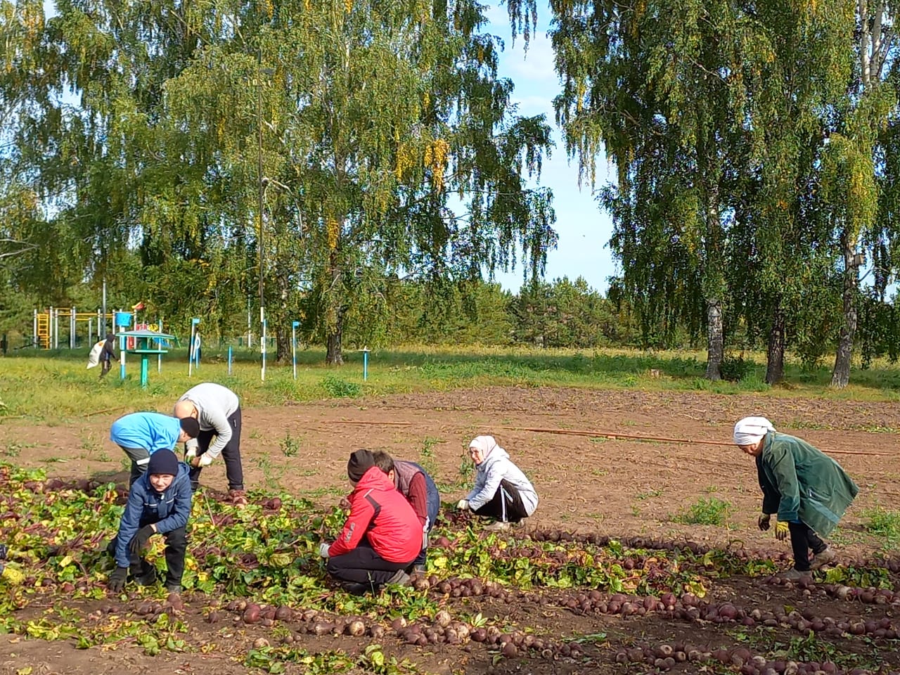 21 сентябрьдә һава торышы безне кояшлы көн белән сөендерде. Без, перчаткалар, чиләкләр, көрәкләр белән коралланып, мәктәп участогында эшләдек, чөгендер, кишер җыештырдык.Барлык укучылар да мәктәп укытучылары белән бергә эшкә җаваплы карадылар, тырышып эшләделәр һәм читкә юнәлмәделәр.Мәктәп участогындагы хезмәт бушка китмәвенә бик шат, безнең уңыш бик яхшы!