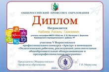 Дипломом Общероссийского Профсоюза Образования награждён Набиев Расиль Газизович, учитель нашей школы, за участие в V ом Всероссийском профессиональном конкурсе «Арктур» в номинации «Педагогический работник , реализующий дополнительные образовательные предпрофессиональные программы»