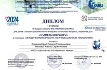 Балалар бакчасы педагоглары (Владимирова Л.И., өлкән тәрбияче, Малова А.С., тәрбияче) "Инновацион технологияләр буенча методик эшләнмә" һәм "Робо-Профи" номинацияләрендә мәктәпкәчә һәм башлангыч мәктәп яшендәге балалар, "Киләчәк планетасы" мәктәпкәчә белем бирү учреждениесе педагоглары өчен III Бөтенроссия фестиваль-конкурсында җиңүчеләр булдылар.