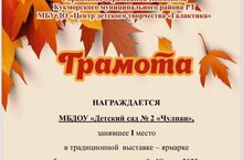1 место за содержание пришкольного участка среди дошкольных образовательных организаций/мәктәпкәчә белем бирү оешмалары арасында участокны саклаган, матурлаган өчен 1 урын дипломы белән бүләкләндек 12.10.2023