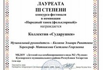 Безнең "Сударушка" балалар бакчасы коллективы "Халык биюе (фольклор)" номинациясендә конкурс-фестивальдә катнашты һәм III дәрәҗә лауреат булды. Җиңүегез белән котлыйбыз һәм коллективка алга таба да уңышлар телибез.