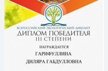 Наша воспитательница, Гарифуллина Диляра Габдулловна, приняла участие во всероссийском экологическом диктанте и стала обладателем диплома! Поздравляем!!!