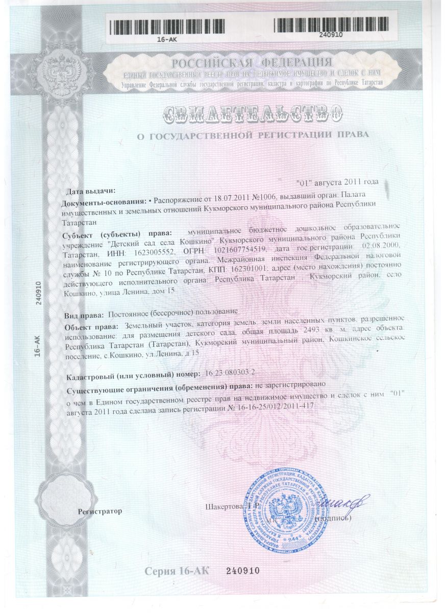 свидетельство регистрации на землю/җирне теркәү таныклыгы