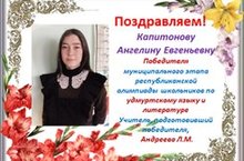 11 сыйныф укучысы Капитонова Ангелина Удмурт теле һәм әдәбияты буенча республика олимпиадасында җиңүче булды (укытучысы Андреева Л.М.). Котлыйбыз! Киләчәктә дә уңышлар телибез!