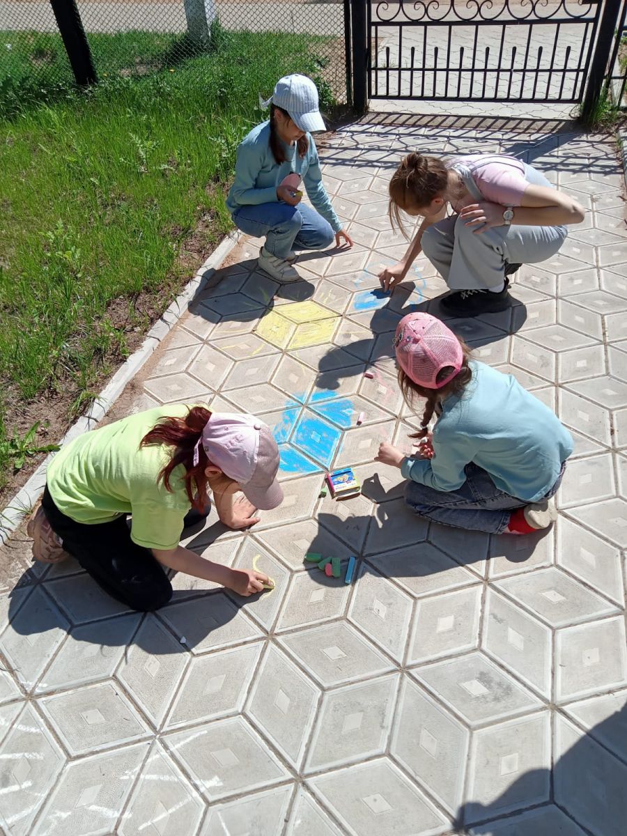 В школе прошла выставка рисунков ко Дню защиты детей. Дети рисовали на асфальте и бумаге.