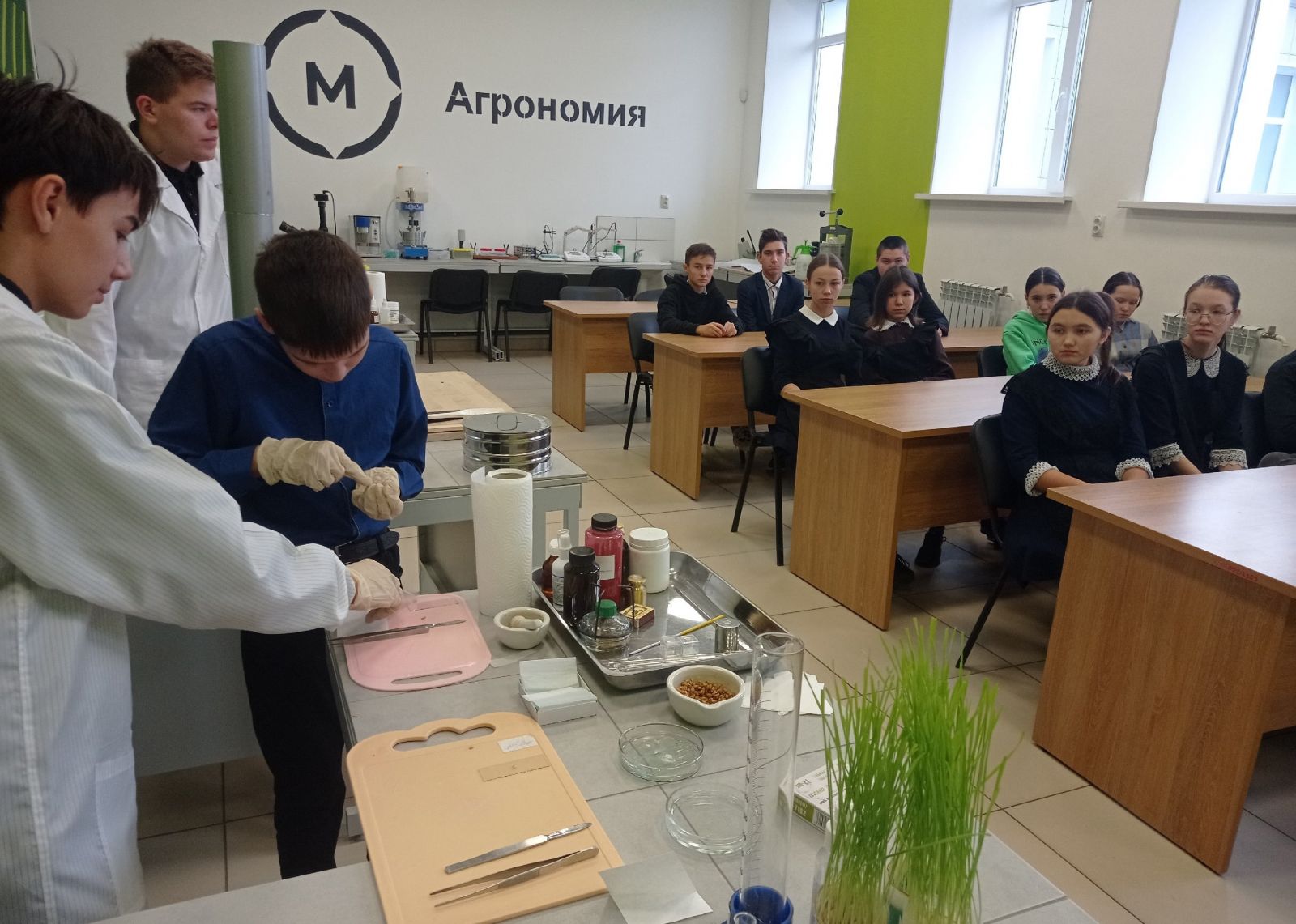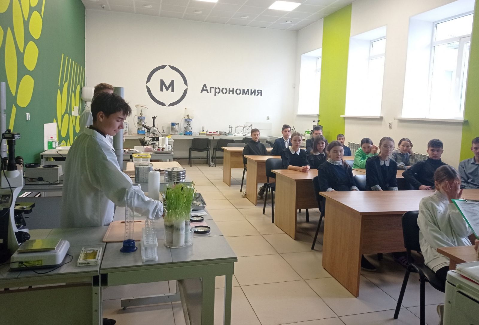 В рамках профориентационного проекта "Билет в будущее" в нашей школе создан "Агрокласс". Учащиеся агрокласса прошли профпробы по "Агрономии"и "Сити-фермерству" в ГБОУ "Кукморский аграрный колледж". Каждый школьник получил профессиональные навыки по "Определению качества роста сеянцев пшеницы", "Монтажу механизмов и датчиков".