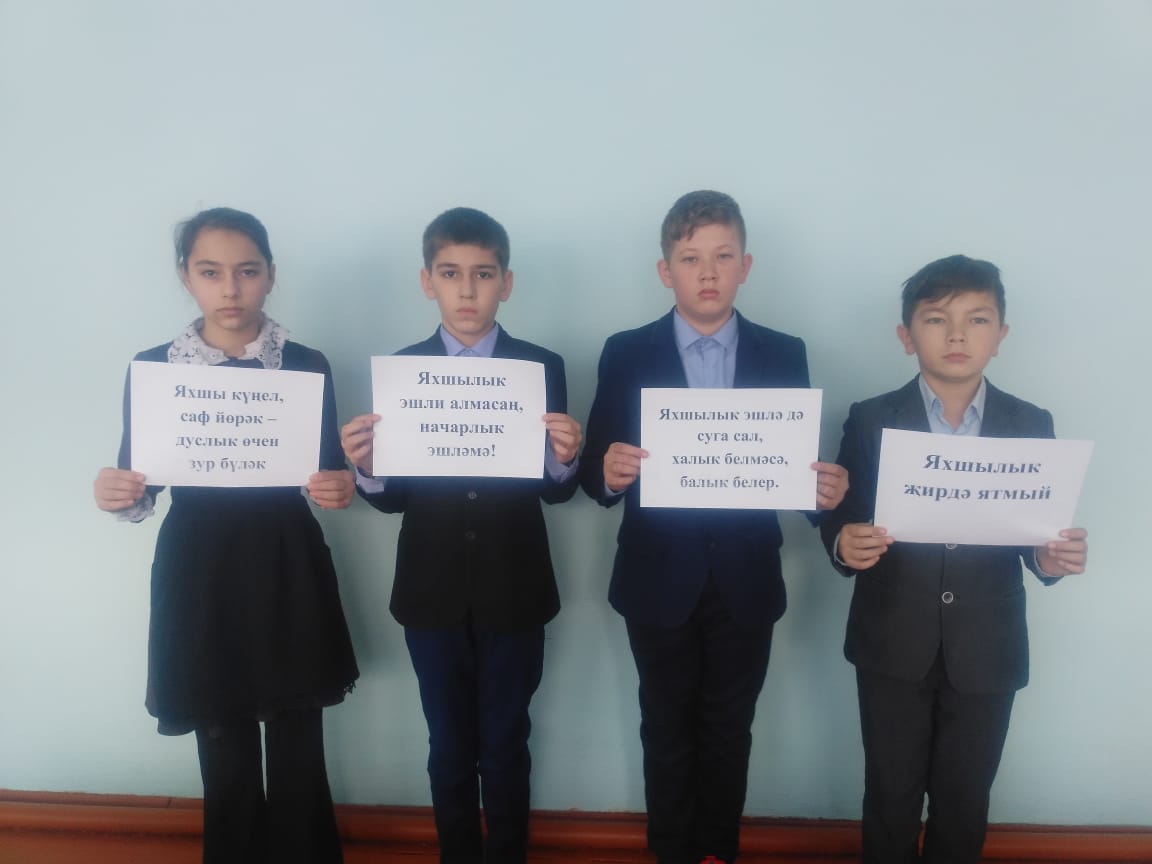 Дәүләт флагларын күтәрү вазыйфасы 7 сыйныф укучылары Самигуллина Нәргизә һәм Шакиров Рифатка бирелде. Алар мәктәбебезнең алдынгы укучылары, олимпиадаларында актив катнашучылар.