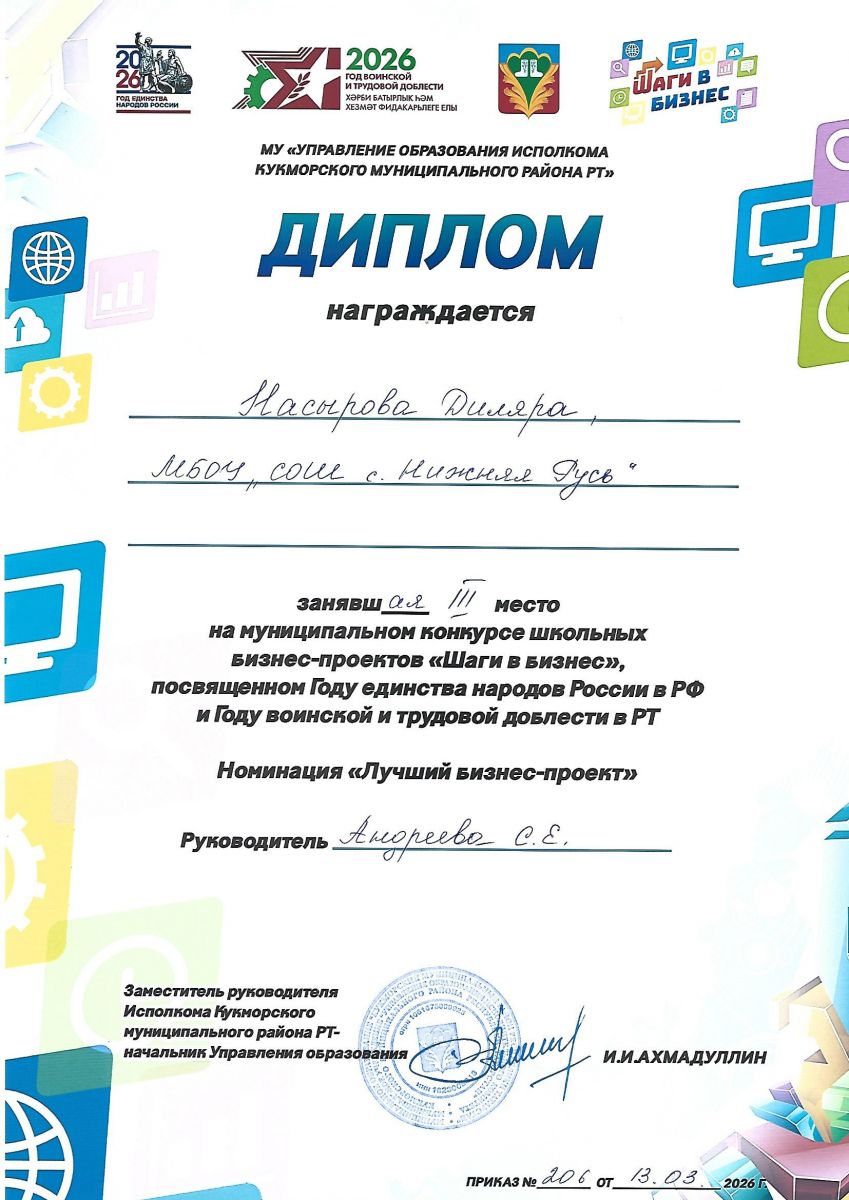 Насырова Диляра (рук. Андреева С.Е.) заняла 3 место в номинации «Лучший бизнес-проект».