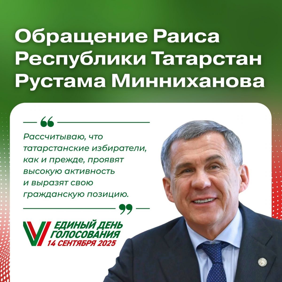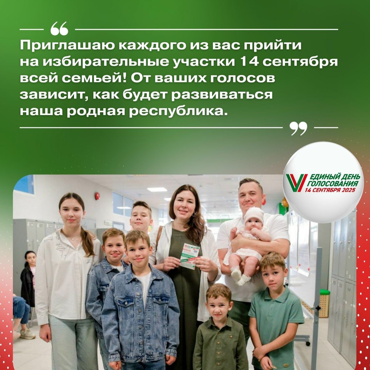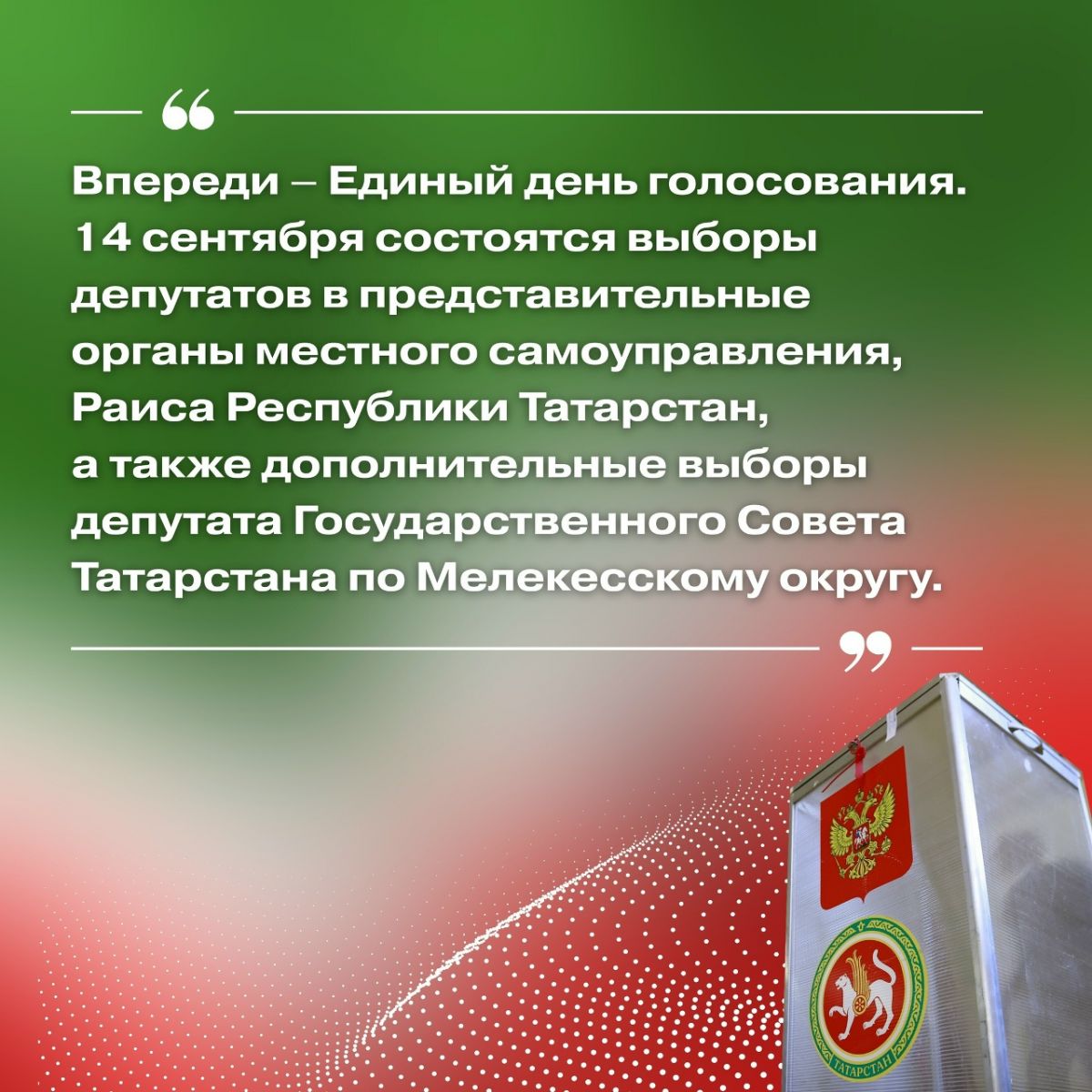 Опубликовано: 10.09.2025Уже в это воскресенье, 14 сентября, пройдет Единый день голосования. Мы будем выбирать Раиса Республики Татарстан и муниципальных депутатов. Избирательные участки будут работать с 7:00 до 20:00. Приходите вместе с семьей, приводите старшее поколение. Не оставайтесь в стороне от важных событий, которые касаются каждого из нас и будущего родного Татарстана. В преддверии выборов к жителям обратился Раис республики Рустам Нургалиевич Минниханов. Он пригласил каждого прийти на избирательные участки. В карточках собрали все самое важное из его обращения. Читайте, отправляйте своим близким и друзьям. Ждем всех 14 сентября на выборах! Голосуй, Татарстан! Выбирай Татарстан!