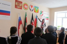 В 5-8 и 9-11 классах урок провел учитель истории Рамазанов В.Н.. Были использованы презентации, тексты Конституций РФ и РТ, Федеральных законов «О государственном гербе РФ», «О государственном флаге РФ», «О государственном гимне РФ». На урок был приглашен депутат районного совета, Оштормаюмьинского сельского поселения директор школы Иванов В.П. .