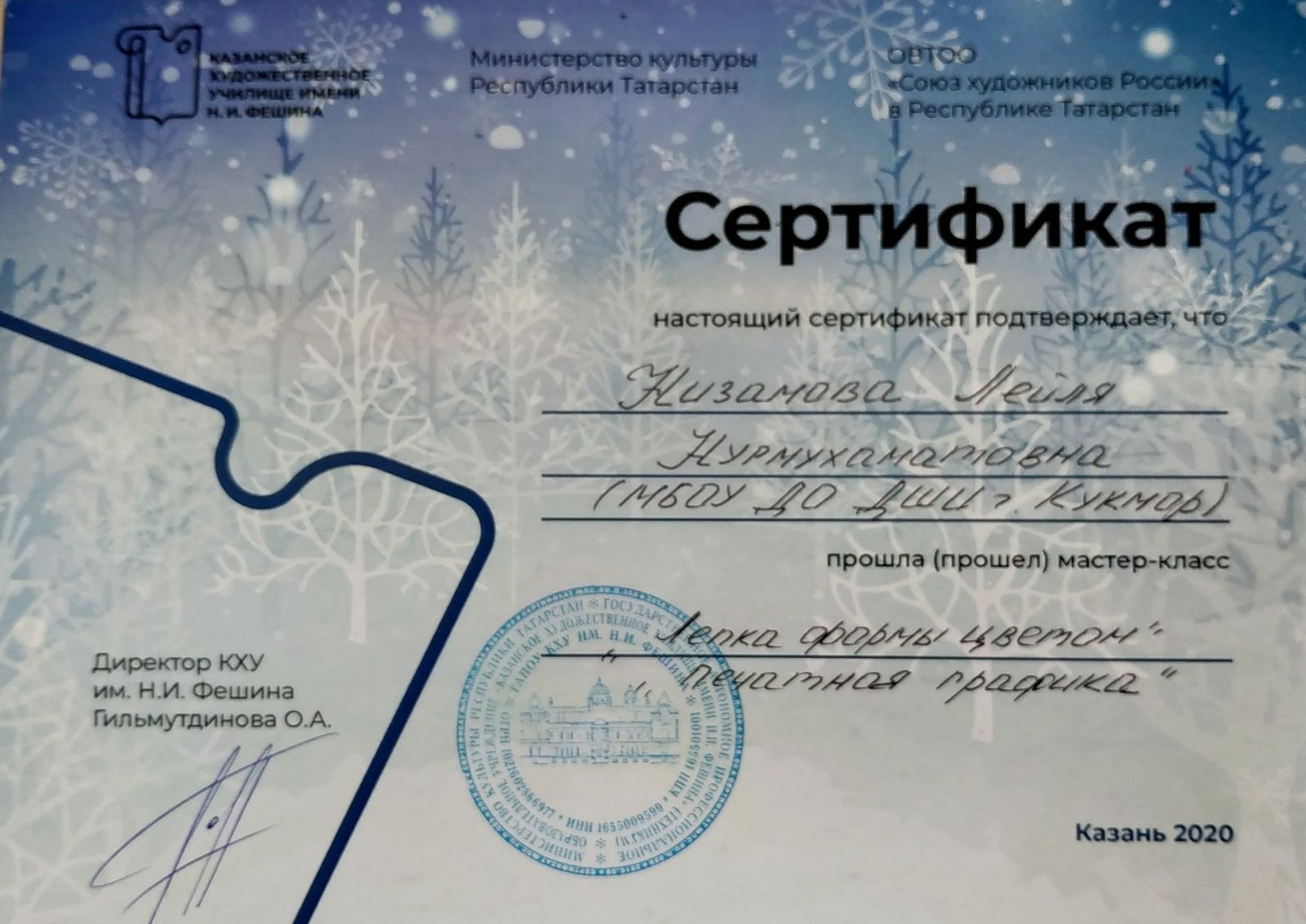 - Низамова Л.Н.- участие в Мастер- классе «Лепка формы цветом- печатная графика», Казанское художественное училище, МК РТ;