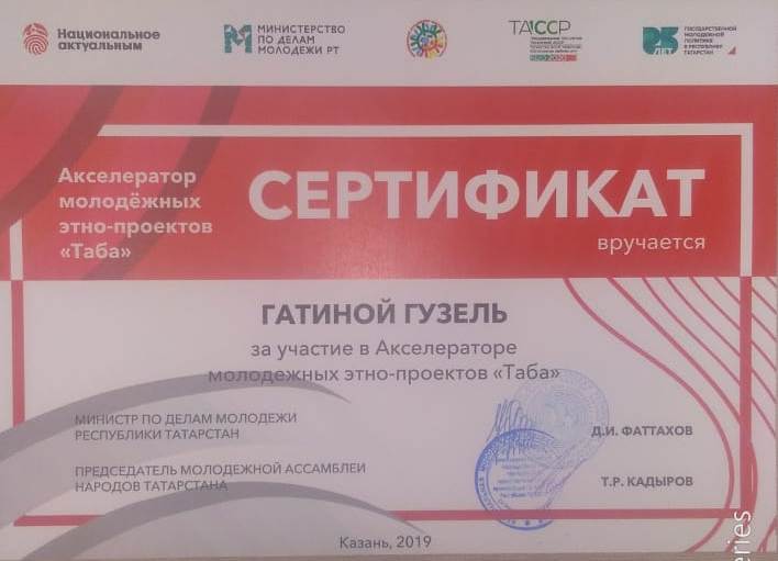 - Гатина Г.И. – Сертификат за участие в Акселераторе молодежных этно- проектов «Таба»;