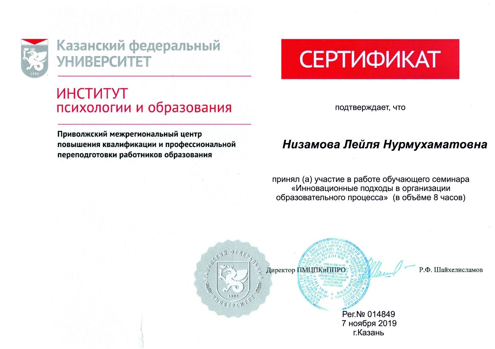 - Низамова Л.Н. - Межрегиональный обучающий семинар «Инновационные подходы в организации образовательного процесса», К(П)ФУ;