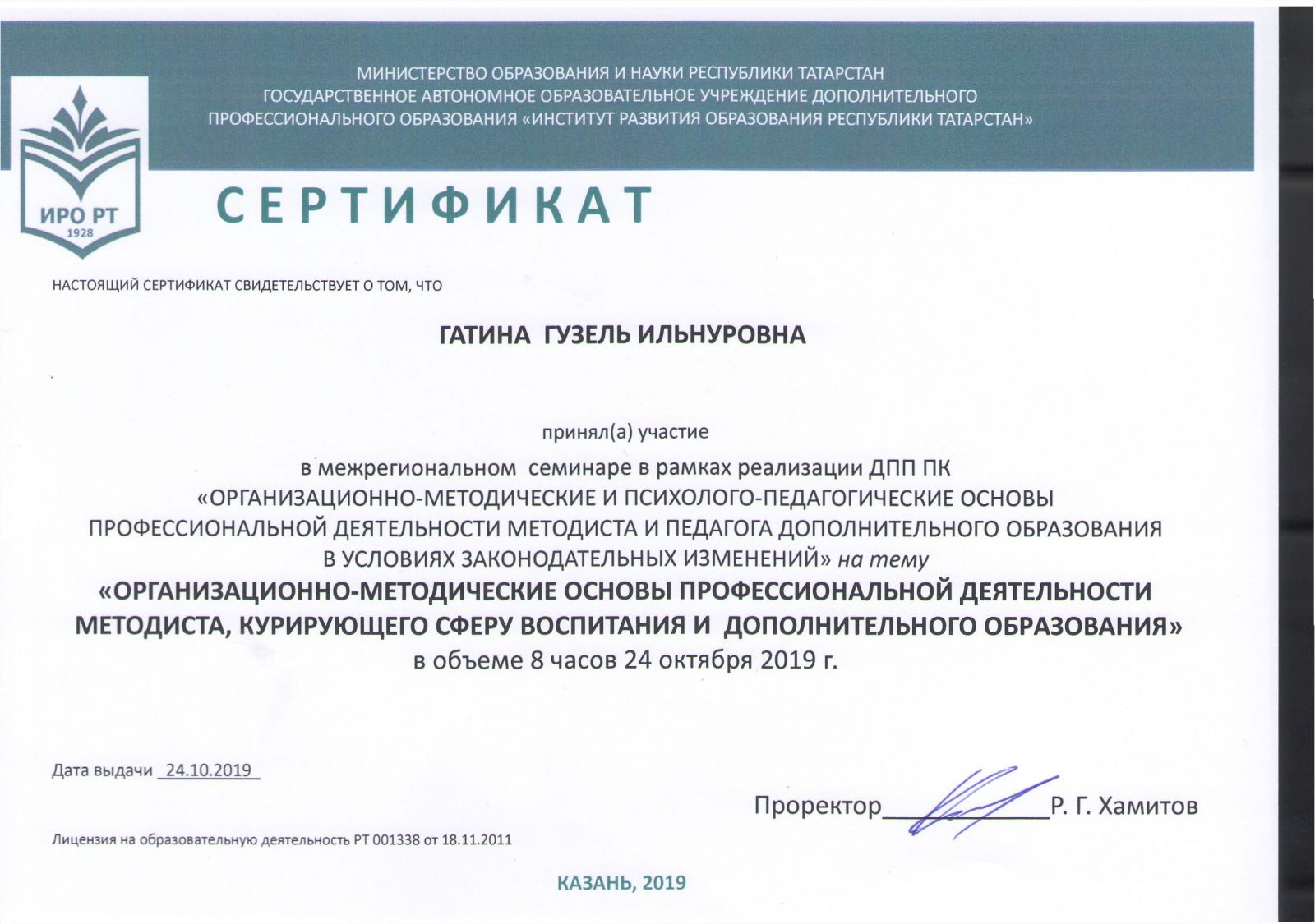 - Гатина Г.И. – Участие в Республиканской стажировке «Организационно- методические основы профессиональной деятельности методиста, курирующего сферу дополнительного образования»;
