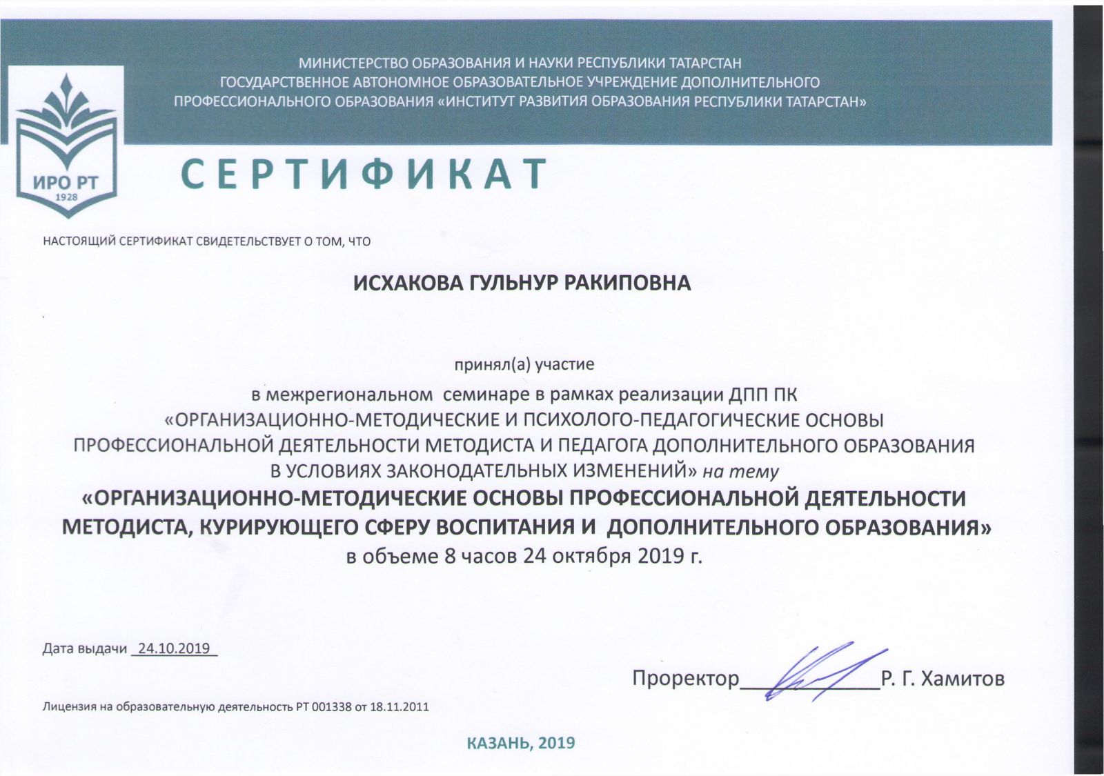 - Исхакова Г.Р.- Участие в Республиканской стажировке «Организационно- методические основы профессиональной деятельности методиста, курирующего сферу дополнительного образования»;
