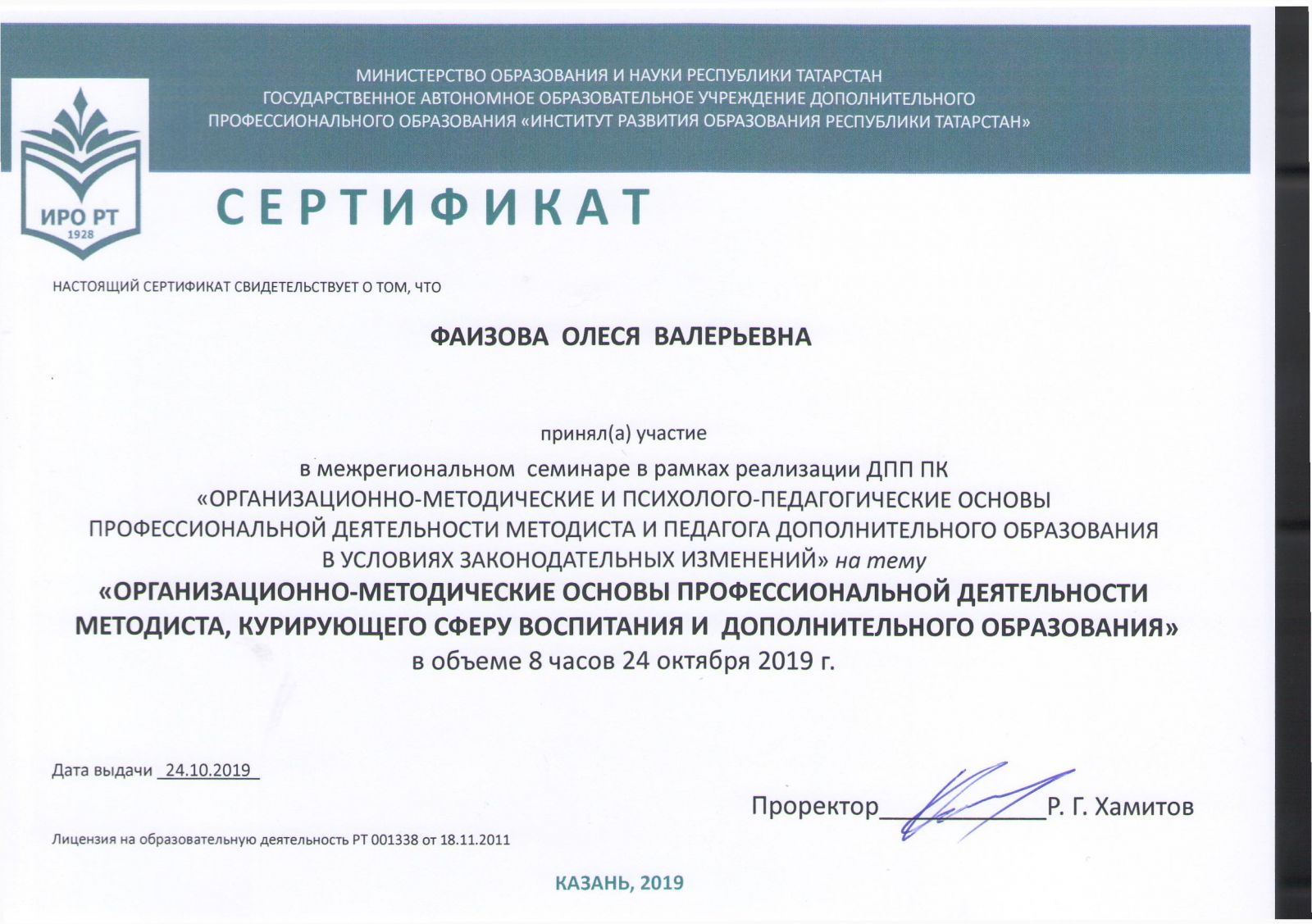 - Фаизова О.В.- Участие в республиканском семинаре «Документационное обеспечение деятельности методической службы ОО ДО», ГБУ ДО «РЦВР»;