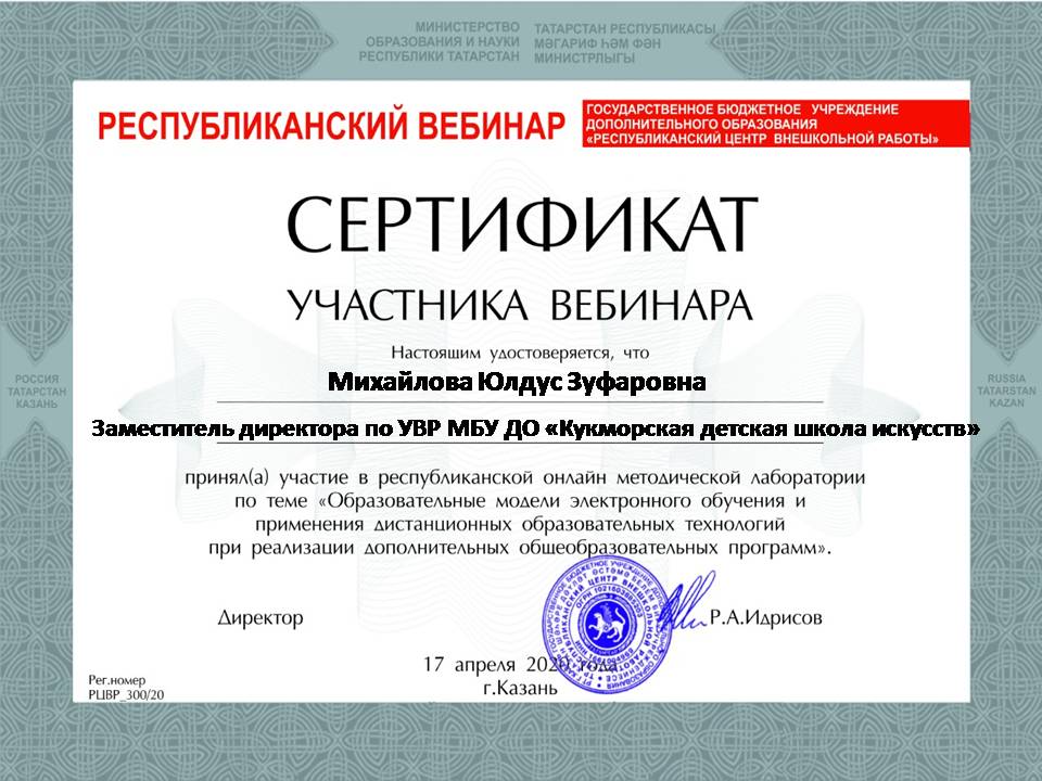 - Михайлова Ю.З. - Участие в республиканской онлайн методической лаборатории «Образовательные модели ЭО и применения ДОТ при реализации дополнительных общеразвивающих программ », ГБУ ДО «РЦВР»;