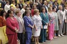 Район башлыгы Сергей Димитриевич һәм Республика Олимпия үзәге директоры Гөлнара Илдаровна укытучыларны ТР ведомстволық бүләкләре белән бүләкләделәр һәм районның иң яхшы укытучыларына ноутбуктар тапшырдылар.