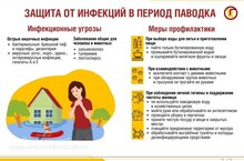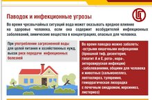 Меры профилактики заболеваний во время паводков При употреблении загрязненной воды для целей питания и хозяйственных нужд, высок риск передачи инфекционных болезней Во время паводка можно заболеть: -острыми кишечными инфекциями (брюшной тиф, дизентерия, гепатит А и Е, рота-, нора-, энтеровирусная инфекции) -заболеваниями, общими для человека и животных (сальмонеллез, лептоспироз, туляремия, геморрагическая лихорадка с почечным синдромом, иерсиниоз, листериоз) используйте для питья бутилированную или кипяченую воду не применяйте в хозяйственных целях паводковую воду мойте руки или обрабатывайте их антисептиком фрукты, ягоды и овощи тщательно промывайте бутилированной водой, ошпаривайте кипятком не купайтесь в зоне паводковых вод не разрешайте детям играть в зоне подтопления и использовать игрушки, загрязненные паводковыми водами, без предварительной дезинфекции храните чистую посуду и вещи в закрытых местах, защищенных от насекомых и грызунов, вне доступа воды обрабатывайте выгребные ямы, надворные туалеты и колодцы дезинфицирующими средствами избегайте контакта с дикими животными и синантропными грызунами