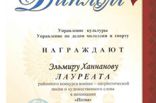 Музыкальный руководитель нашего детского сада- Ханнанова Эльмира Рафилевна стала лауреатом районного конкурса военно-патриотической песни и художественного слова в номинации "Песня". Мы поздравляем её и желаем ей дальнейших творческих успехов.