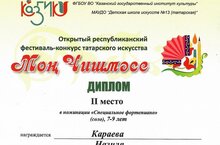 31 марта МАУДО "Детская школа искусств №13 (татарская)" г.Набережные Челны состоялся Открытый республиканский фестиваль-конкурс татарского искусства «Моң чишмәсе». В номинации «Специальное фортепиано» приняли участие учащиеся нашей школы. Хабибуллина Язгуль (преп.Шаймарданова З.К.) заняла 2 место и Караева Назиля (преп.Хакимуллина А.Л.) – 2 место! Поздравляем!!! Желаем здоровья, вдохновения и дальнейших творческих успехов!