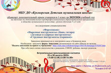 МБУ ДО «Кукморская Детская музыкальная школа» объявляет прием в 1 класс на 2025/2026 учебный год по дополнительным предпрофессиональным образовательным программам в области музыкального искусства