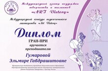 Преподаватель по классу скрипки Гумарова Эльмира Габдрашитовна приняла участие в конкурсах педагогического мастерства. В международном конкурсе педагогического мастерства «Art Victory» г.Москва удостоилась звания Гран-При, в IV Всероссийском квалификационном конкурсе педагогических методических работ, посвященном Дню учителя – звания Лауреата 1 степени! Желаем Вам здоровья, вдохновения, успехов в творческой деятельности!Котлыйбыз!!! Скрипка сыйныфы укытучысы Гумарова Эльмира Габдрәшит кызы педагогик осталык конкурсларында катнашты. «Art Victory» Халыкара педагогик осталык конкурсында Мәскәү шәһәрендә Гран-При исеменә лаек булды, Укытучылар көненә багышланган IV Бөтенроссия педагогик методик эшләр конкурсында - 1 дәрәҗә Лауреат! Сезгә сәламәтлек, илһам, иҗади эшчәнлектә уңышлар телибез!