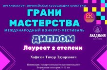Подведены итоги Международного фестиваля-конкурса "Грани мастерства", прошедшего в конце декабря 2021 года в г.Санкт-Петербург. В номинации "Инструментальное исполнительство" учащийся отделения духовых и ударных инструментов Хафизов Тимур (преп.Хасанов М.Р.) удостоился звания Лауреата 2 степени! Поздравляем!