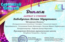 С 18 ноября по 15 декабря ГБУ "Ресурсный центр внедрения инноваций и сохранения традиций в сфере культуры Республики Татарстан" с целью выявления творческого потенциала детей для развития профессионального музыкального образования РТ, сохранения и развития музыки с национальной интонацией народов, проживающих в Республике Татарстан, популяризации музыки композиторов Республики Татарстан был организован Республиканский конкурс юных дарований. Учащийся 2 класса отделения народных инструментов Бикбов Сайдаш (преподаватель Рафиков Д.Ф.) удостоился звания Лауреата 2 степени и денежного приза! Поздравляем!!!