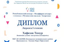 14 сентября 2021года на расширенном заседании Главы Кукморского района с главами сельских поселений, руководителями организаций и учреждений награжден Почетной грамотой Главы Кукморского муниципального района Хафизов Тимур (преподаватель Хасанов М.Р.) за достигнутые успехи и высокие результаты на конкурсах различного уровня!!! Поздравляем наших учащихся и преподавателей с заслуженной наградой!