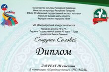 25 марта 2021 года в г.Орел состоялся Всероссийский фестиваль-конкурс художественного творчества "ТВОРЧЕСКИЕ ЛЮДИ". В конкурсе принял участие ансамбль "Сандугач" (рук.Каримуллин Н.Р., Юзмеева З.А.) и удостоились звания Лауреата 3 степени, преподаватель Каримуллин Н.Р. в номинации "Народное пение" - Лауреата 2 степени. Поздравляем!!!