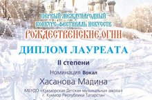 Поздравляем победителей Первого международного фестиваля-конкурса искусств "Рождественские огни", прошедшего в г.Вологда. Конкурс проводился в рамках реализации национального проекта "Культура" с целью патриотического и духовно-нравственного воспитания молодого поколения. Результаты конкурса: