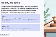 Среди обучающихся 6–11 классов прошли классные часы, посвящённые вопросам правовой ответственности несовершеннолетних. Учащимся были разъяснены положения статей Уголовного кодекса Российской Федерации, касающиеся таких преступлений, как умышленное уничтожение или повреждение чужого имущества, террористический акт, государственная измена и диверсия. Также было уделено внимание таким формам противоправного поведения, как буллинг, хулиганство и клевета, за которые предусмотрены различные виды наказаний, начиная от штрафов и заканчивая лишением свободы. Важно отметить, что незнание закона не освобождает от ответственности, поэтому каждому учащемуся рекомендовано внимательно изучить предоставленную информацию.