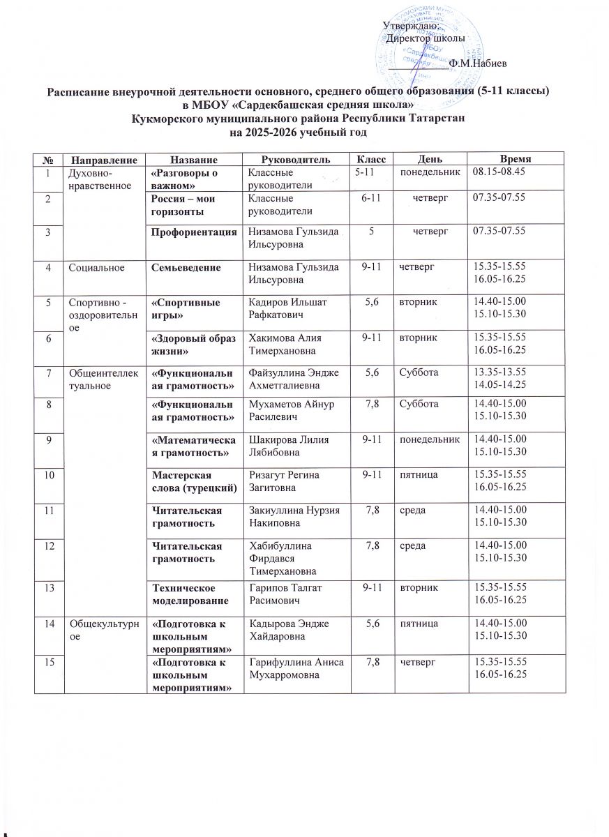 Расписание занятий внеурочной деятельности на 2025-2026 учебный год
